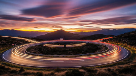 Winding mountain road with light trails at night