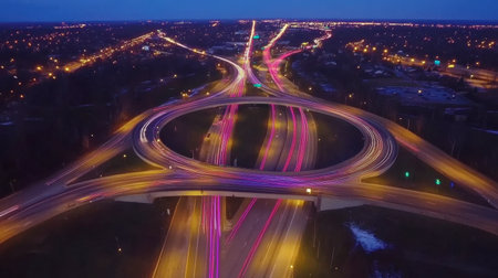 Captivating aerial view showcasing a bustling urban interchange at night, with vibrant traffic trails and bright city lights creating an energetic atmosphere.
