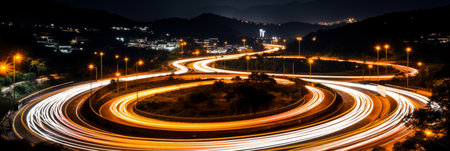 interchange ring road motorway freeway and expressway connecting the city transportation traffic for a car aerial top view long exposure shot at night