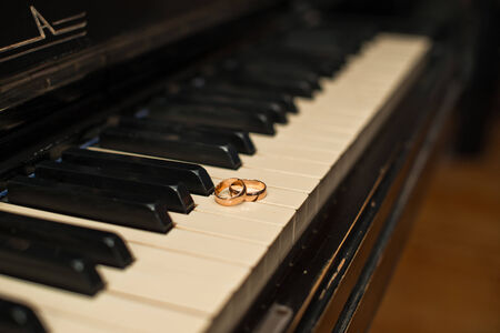 Wedding rings on piano keys.
