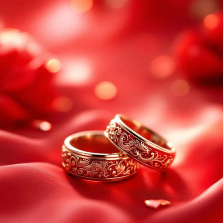 Wedding rings on red satin background with bokeh