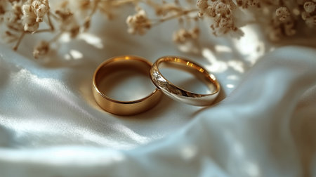 Two gold wedding rings are elegantly placed on smooth fabric, accompanied by small white flowers, symbolizing love and commitment in a serene setting.