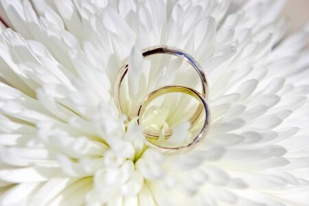 white gold wedding rings on a delicate white chrysanthemum flower