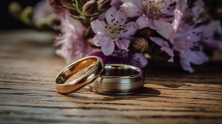 Wedding rings and flowers on the background of the window. Ai generated