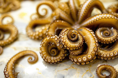 Octopus tentacles, intricately curled and textured, rest on a smooth surface. The soft, fleshy surface of each arm is highlighted by a pattern of small, round suckers.
