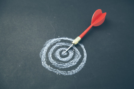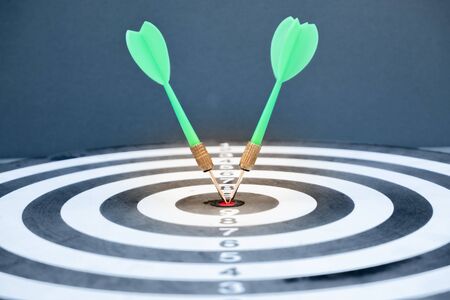 Concepts of business strategy and goals. Red darts embroidered on the Dartboard on black background with orange light. Dart in the bullseye.