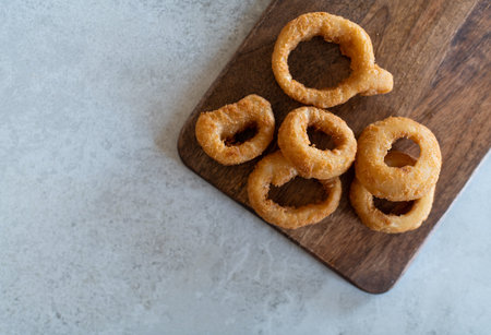 Homemade, delicious Onion Rings. Served on a wooden board.