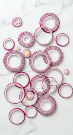 Sliced red onion rings on white marble background, top view