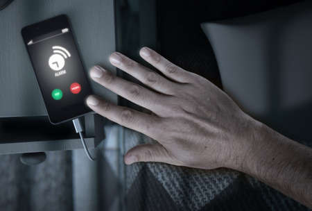 A night time scene of a bed side table and a generic smartphone with its alarm ringing and a hand touching it - 3D Render