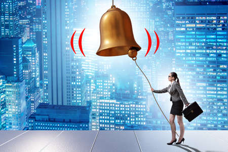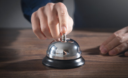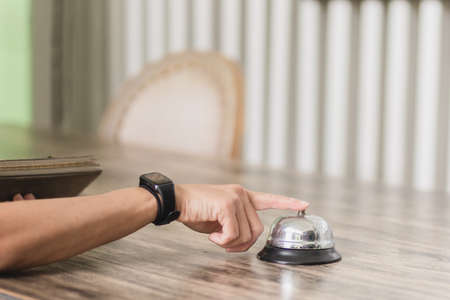 Bell service on counter wiith hand, Bell call for service with bokeh background