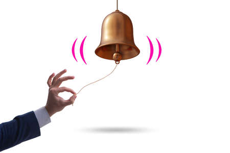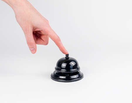 Pressing your hand on the bell of the hotel service on a white background.Concept hotel, travel and vacation