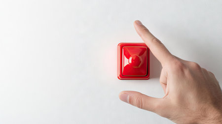 Hand reaching toward a red fire alarm button on a clean white wall, capturing urgency and emergency preparedness