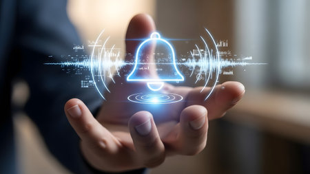 A hand displays a glowing bell icon surrounded by digital sound waves and data charts. Clear deta...