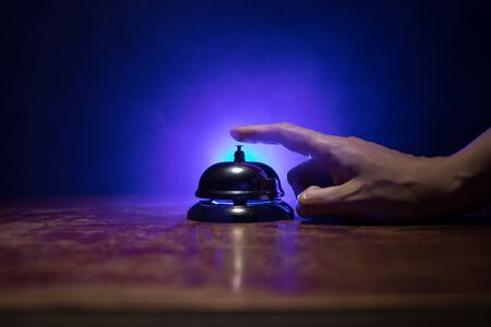 Calling service bell on wooden table with toned lights on dark background. Hotel reception bell, Hand ringing in service bell , selective focus
