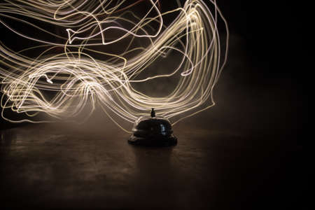 Calling service bell on wooden table with toned lights on dark background. Hotel reception bell, service bell on the table, selective focus