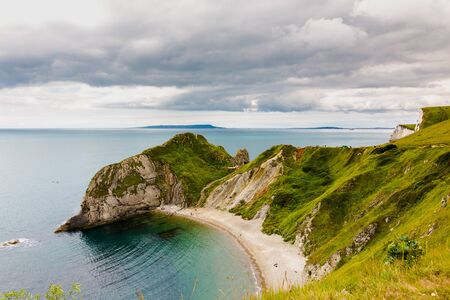 Beach on a bay cover with cliffs by English coast. Horizontal full frame orientation with high horizon and cloudy sky