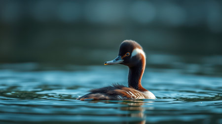 Unique duck swimming gracefully in a tranquil lake during early morning light