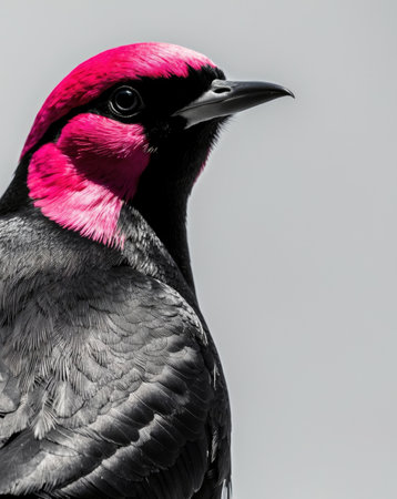 AI Generated. A tight shot of a bird with a pink head and a black body