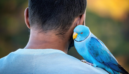 A colorful blue bird rests comfortably on a persons shoulder while they admire the outdoors.