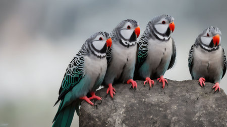 A charming scene featuring two colorful tropical birds expressing affection amidst vibrant green foliage. This intimate moment captures the beauty of nature's wildlife.