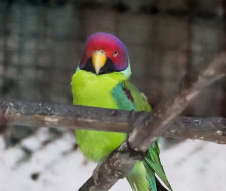 Lord Derbys Parakeet Or Psittacula Derbiana, Also Known As Derbyan Parakeet. Wild Bird In Cage