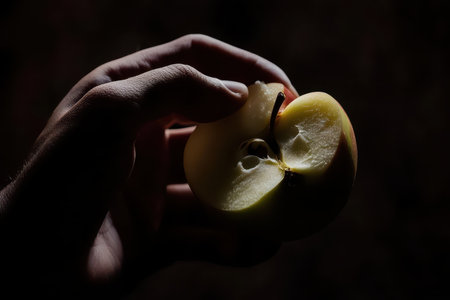 Hand holding a freshly bitten apple slice in dramatic low-key lighting. AI-generated.