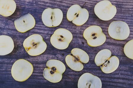 healthy plant-based food ingredients concept, apple halves on wooden table