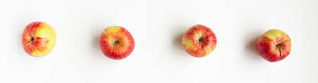 Banner flat lay top view of four red apples on white background. Food concept