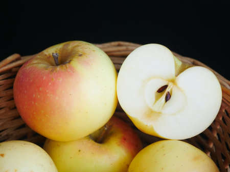 Kazakhstan's apple varieties with strong fragrance, filled in baskets, Cut open to see the seeds