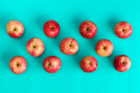 Fruit pattern of red apple on blue background. Flat lay, top view. Pop art design, creative summer concept. Food background.