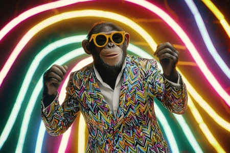 A cheerful chimpanzee dressed in a vibrant, patterned suit and oversized sunglasses poses playfully against a backdrop of neon lights.