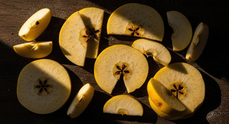 Sliced apples in warm sunlight on wooden surface