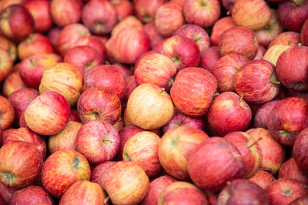 Red apples background. Fresh organic red apple stands out among many apples background in the market. Closeup shot of fresh red and yellow apple