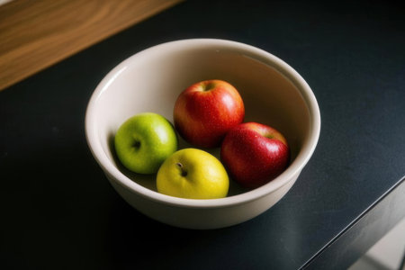 Red and green apples in a white bowl on a black background.