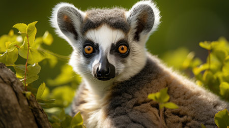Lemur Catta displays captivating gaze while resting in its natural habitat during daylight hours in a serene forest environment