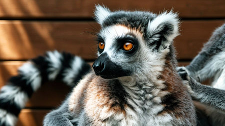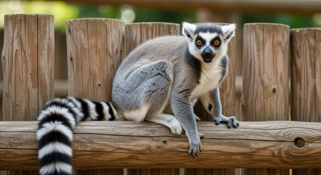 A striking ring-tailed lemur poses for the camera, its iconic striped tail prominent, set against a rustic wooden backdrop in a naturalistic environment.