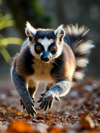 A lemur with yellow eyes and a striped tail is captured in mid-jump on a ground covered with leaves
