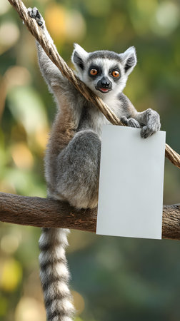 A playful ring tailed lemur is hanging from a tree branch with one arm while holding a blank white sign with the other. The scene is set in a lush forest, making this image ideal for use as a mockup, wildlife template, or creative advertising design.