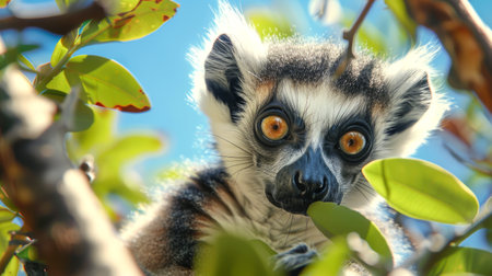 Curious lemur peering through leaves in rainforest. Wildlife photo for nature documentaries