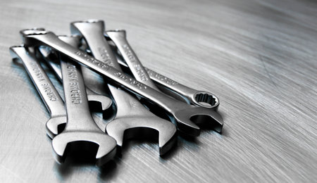 Set of chrome wrenches on steel surface. Mechanic tools for maintenance. Hardware tools to fix. Technical tools background