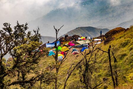 Yellow tents on the mountain above the clouds. Trek to Mount Rinjani, Lombok, Indonesia