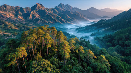 An aerial view showcases a vibrant green forest nestled amidst towering mountains. The scene features varying shades of green, with sunlight filtering through, creating a textured composition. Mist fills the valleys, adding depth and a sense of tranquility. Ideal for illustrating environmental themes or travel publications.