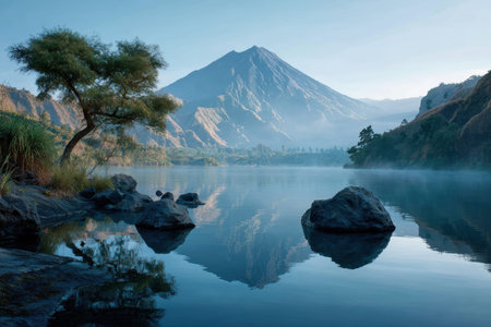 Morning light reveals the reflection of a volcanic mountain in a calm lake surrounded by lush landscapes and serene rock formations