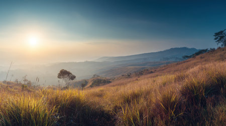 Experience a stunning sunrise over rolling hills adorned with vibrant grasslands and enveloped in soft mist, capturing the essence of tranquility in nature's embrace.
