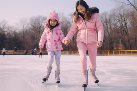 Happy Asian mom and daughter skating in pink warm clothes by the hand on ice skating rink