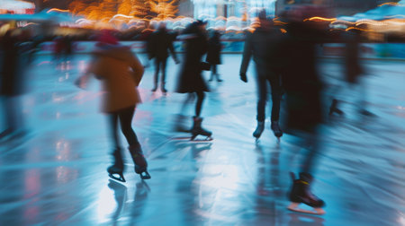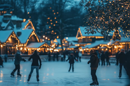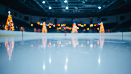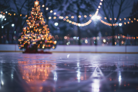 Warm blurred ice rink lights create a festive winter atmosphere with cozy holiday glow