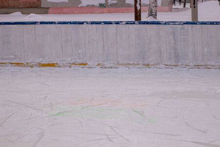 Ice hockey rink background. Blurred ice hockey rink with ice skates, Close-up of ice in a hockey rink, AI Generated