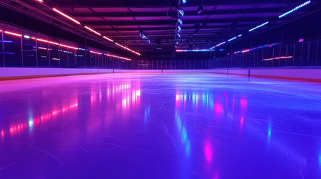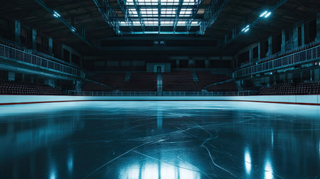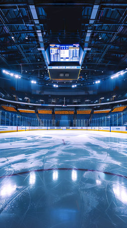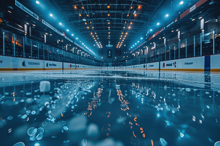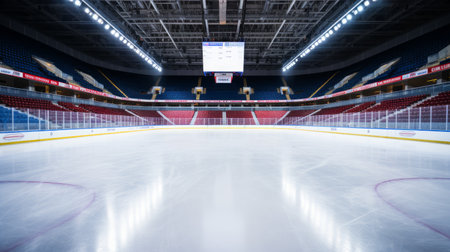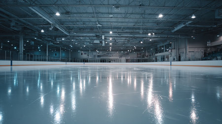 Brightly illuminated ice hockey rink, completely empty with reflections on the freshly cleaned ice, waiting for players to arrive