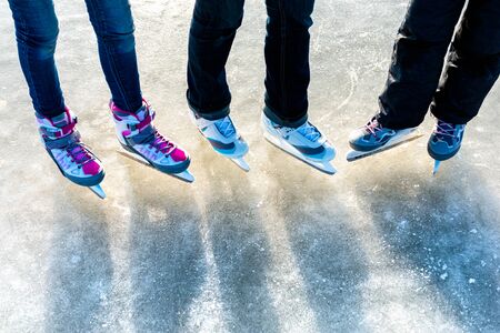 Top view on the feet in skates in casual wear on the ice. Family, mom, dad and son skate on a winter day. Winter fun.