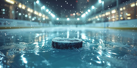 A hockey rink with a solitary puck resting in the center, waiting to be put in motion by players in a fast-paced game of strategy and skill.